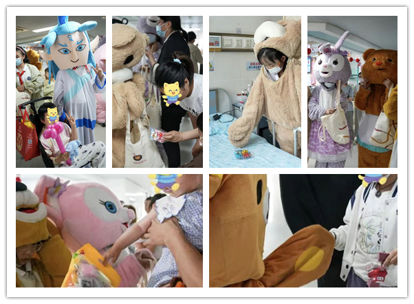 來自南師附小的學(xué)生志愿者們身著可愛童趣的卡通人偶服裝,化身成為孩子們喜愛的動(dòng)畫角色,與住院患兒互動(dòng)交流,希望緩解孩子們住院治療期間的緊張情緒。志愿者們還為每位住院患兒送上了節(jié)日禮物,每一份禮物都飽含著對(duì)孩子們?cè)缛湛祻?fù)的美好祝愿和真誠(chéng)祝福。